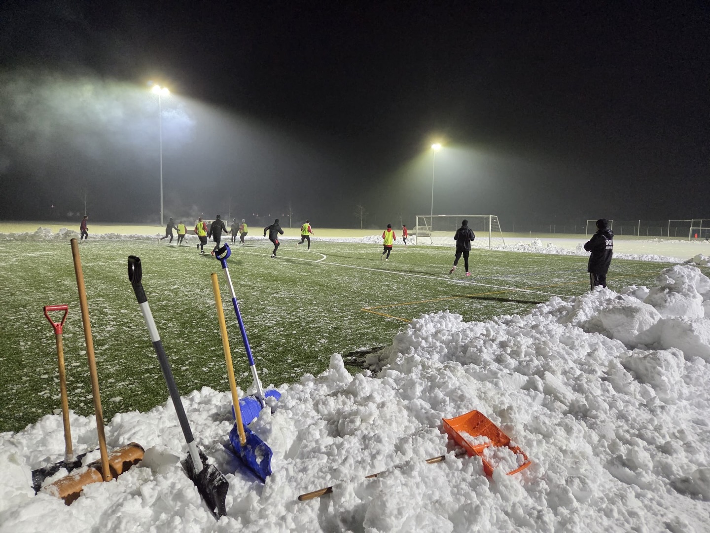 So mussten die Kicker des SVO Germaringen erst einmal den Kunstrasenplatz in Denklingen freischaufeln, bevor man mit dem Training beginnen konnte.