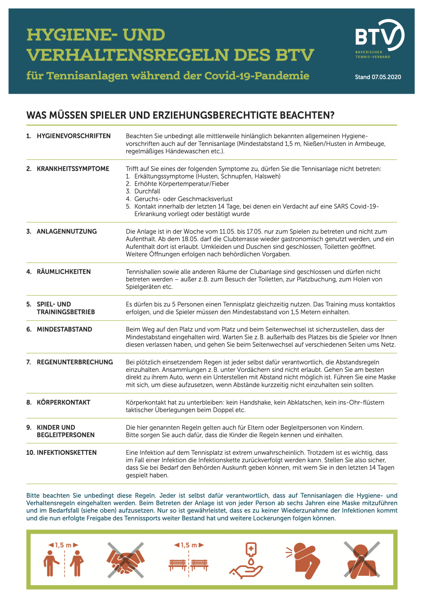 Die Tennisabteilung weist ausdrücklich darauf hin, dass jeder Spieler und Erziehungsberechtigte selbst für die Einhaltung der Hygienie- und Verhaltensregeln verantwortlich ist.